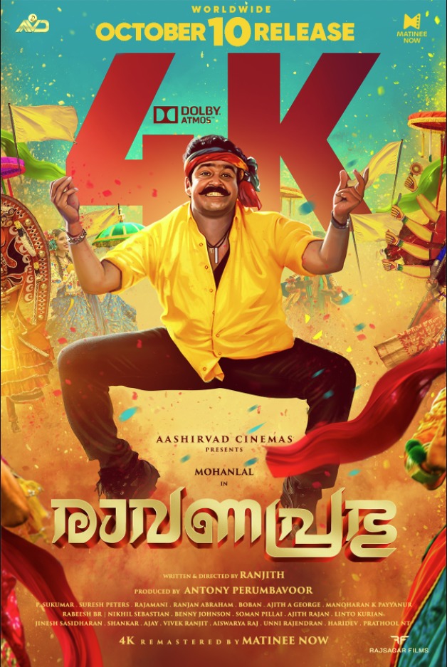 നൂതന ദൃശ്യ. ശബ്ദ വിസ്മയങ്ങളുമായി 4k ആറ്റ്മോസിൽരാവണ പ്രഭു എന്ന ചിത്രം വീണ്ടും പ്രേക്ഷകർക്കു മുന്നിലെത്തുകയാണ്.ഒക്ടോബർ പത്തിന് ഈ ചിത്രം പ്രദർശനത്തിനെത്തുന്നു.രഞ്ജിത്ത് തിരക്കഥ രചിച്ച് സംവിധാനം ചെയ്ത ഈ ചിത്രത്തിലെ ജനപ്രിയരായമംഗലശ്ശേരി നീലകണ്ഠനും, കാർത്തികേയനും , മുണ്ടക്കൽ ശേഖരനുമൊക്കെ പ്രേക്ഷകരുടെ എക്കാലത്തേയും ജനപ്രിയ കഥാപാത്രങ്ങളാണ്.ആശിർവാദ് സിനിമാസിൻ്റെ ബാനറിൽ ആൻ്റെണി പെരുമ്പാവൂർ നിർമ്മിച്ച ഈ ചിത്രം 4Kഅറ്റ്മോസിൽ എത്തിക്കുന്നത് മാറ്റിനി നൗ എന്ന കമ്പനിയാണ്. മോഹൻലാൽ ഡബിൾ റോളിൽ എത്തുന്ന ഈ ചിത്രത്തിൽ നെപ്പോളിയൻ, സിദ്ദിഖ്, രതീഷ്,സായ് കുമാർ, ഇന്നസൻ്റ്, വസുന്ധരാ ദാസ്, രേവതി, ഭീമൻ രഘു , അഗസ്റ്റിൻ,രാമു, മണിയൻപിള്ള രാജു, തുടങ്ങിയ വലിയ താരനിര തന്നെ അണിനിരക്കുന്നു. സുരേഷ് പീറ്റേഴ്സിൻ്റേതാണു സംഗീതം.ഗാനങ്ങൾ – ഗിരീഷ് പുത്തഞ്ചേരിഛായാഗ്രഹണം – പി.സുകുമാർ.മറ്റിനിനൗ ഒക്ടോബർ പത്തിന് ഈ ചിത്രം പ്രദർശനത്തിന് എത്തി ക്കുന്നു.വാഴൂർ ജോസ്..