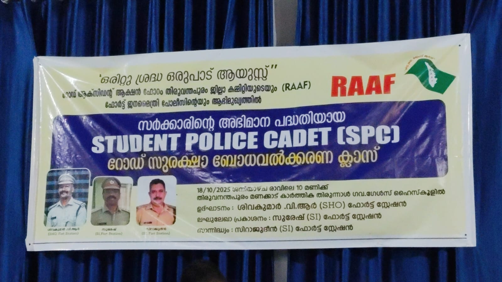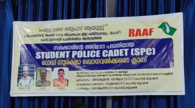 തിരുവനന്തപുരം : റോഡ് ആക്സിഡൻ്റ് ആക്ഷൻ ഫോറാം തിരുവനന്തപുരം ജില്ലാ കമ്മിറ്റിയുടെയും ആർഎഎഎഫ്ൻ്റെയും ഫോർട്ട് ജനമൈത്രി പോലീസിൻ്റെയും ആഭിമുഖ്യത്തിൽ സർക്കാറിൻ്റെ അഭിമാന പദ്ധതിയായ സ്റ്റുഡൻ്റ് പോലീസ് കാഡിനറ്റ് കുട്ടികൾക്കായി ബോധവൽക്കരണ ക്ലാസ് സംഘടിപ്പിക്കുന്നു. ഇന്ന് പകൽ 10 മണിക്ക് തിരുവനന്തപുരം മണക്കാട് കാർത്തിക തിരുനാൾ ഗവ : ഗേൾസ് ഹൈസ്കൂളിലാണ് പ്രോഗ്രാം. ഉദ്ഘാടനം ഫോർട്ട് സ്റ്റേഷൻ എസ് എച്ച് ഒ വി ആർ ശിവകുമാർ , ലഘുലേഖാ പ്രകാശനം ഫോർട്ട് സ്റ്റേഷൻ എസ് ഐ സുരേഷ് , ഫോർട്ട് സ്റ്റേഷൻ എസ് ഐ സിറാജുദ്ദീൻ, എന്നിവർ പങ്കെടുക്കുന്നു.