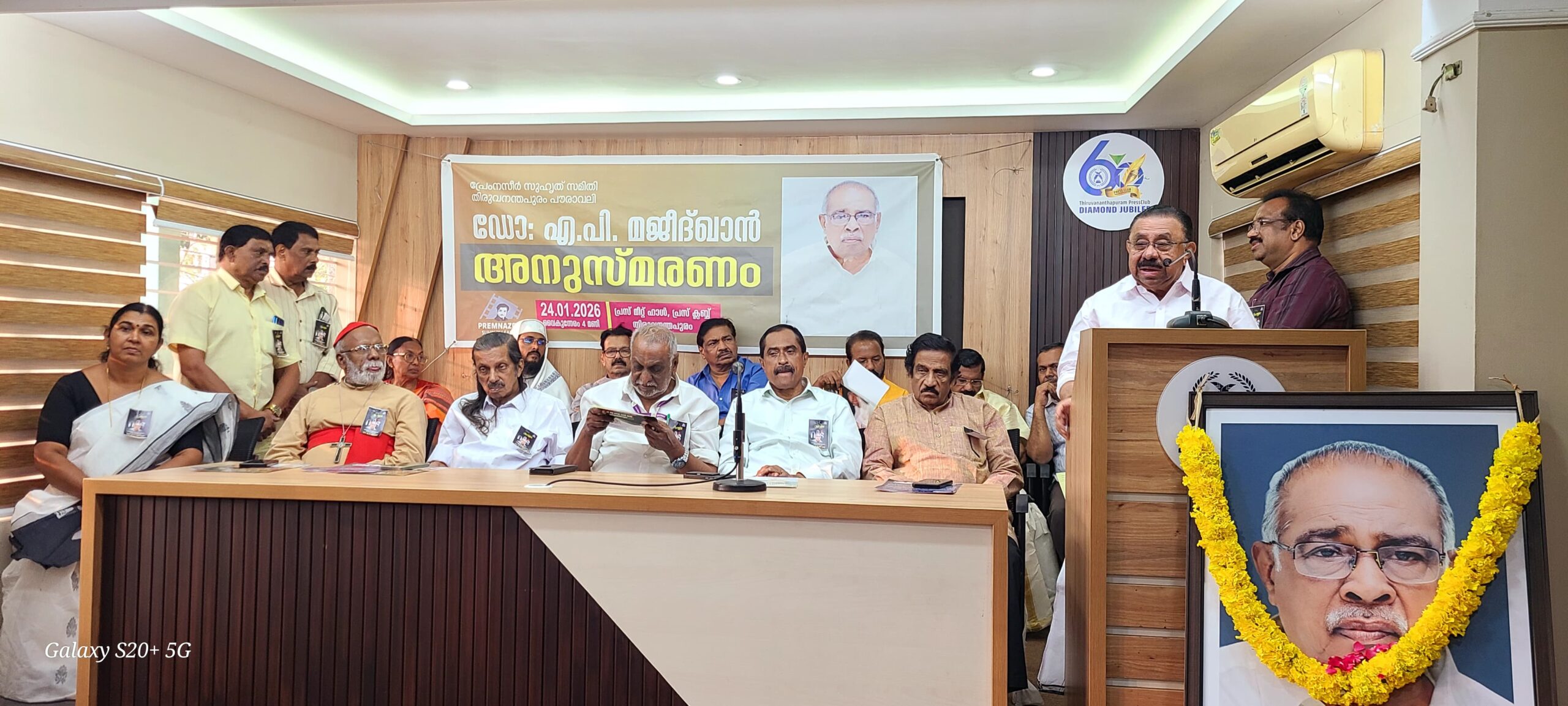തിരു: നൂറുൽ ഇസ്ലാം സർവകലാശാല ചാൻസിലർ ഡോ:എ.പി. മജീദ് ഖാനെ തിരുവനന്തപുരം പൗരാവലി അനുസ്മരിച്ചു. പ്രസ്ക്ലബ്ബ് ഹാളിൽ പ്രേംനസീർ സുഹൃത് സമിതി സംഘടിപ്പിച്ച അനുസ്മരണ യോഗം മുൻ മന്ത്രി എം.എം. ഹസ്സൻ ഉൽഘാടനം ചെയ്തു. ഇ. എം. നജീബ് അദ്ധ്യക്ഷതവഹിച്ചു. ഡോ: വാഴമുട്ടം ചന്ദ്രബാബുവിൻ്റെ മതമൈത്രി ഗാനവും