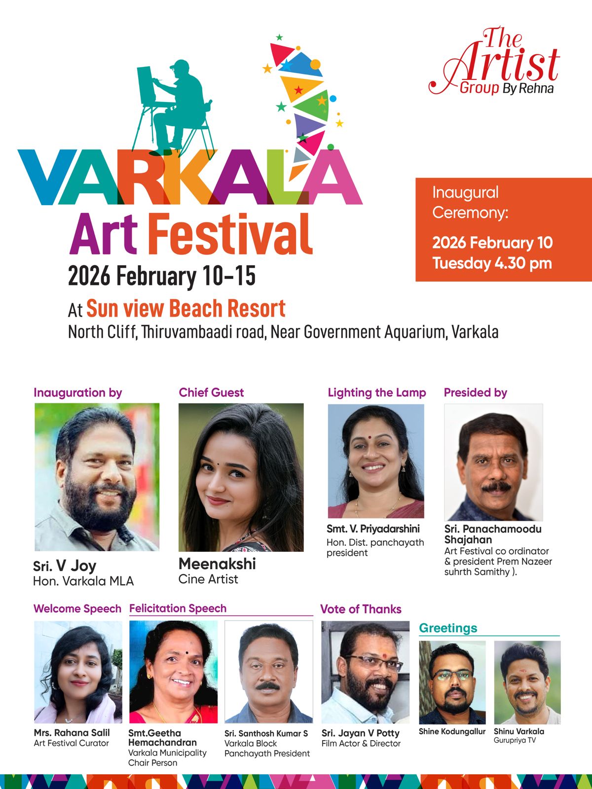 വർക്കല മുനിസിപ്പാലിറ്റി ചെയർപേഴ്സൺ ഗീത ഹേമചന്ദ്രൻ, ബ്ലോക്ക് പഞ്ചായത്ത് പ്രസിഡൻറ് സന്തോഷ് കുമാർ, ചലച്ചിത്ര അഭിനേതാവും സംവിധായകനുമായ ജയൻ വി. പോറ്റി, എന്നിവർ സംസാരിക്കും. ആർട്ട് ഫെസ്റ്റിവൽ ക്യൂറേറ്റർ രഹന സ്വാഗത പ്രസംഗം നടത്തും.