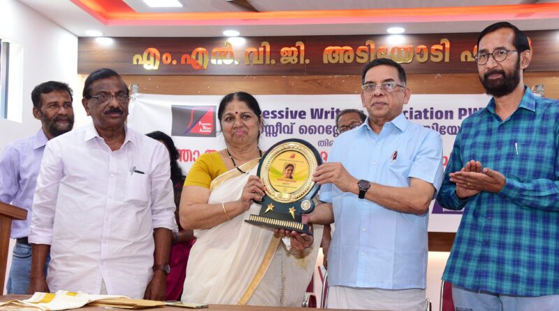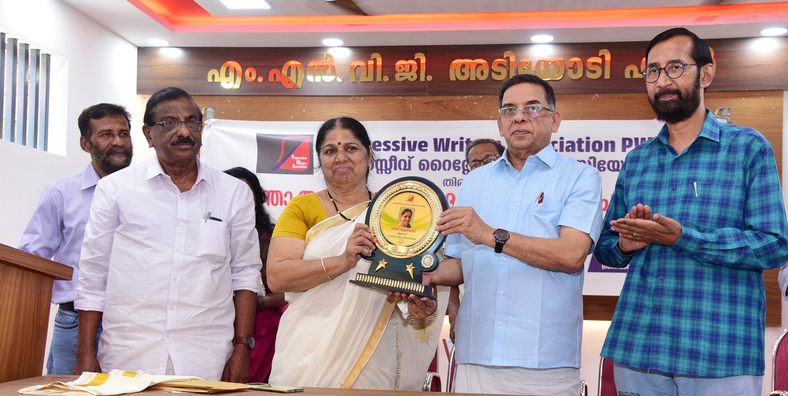 പ്രോഗ്രസ്സീവ് റൈറ്റേഴ്സ് അസോസിയേഷന്റെ ആഭിമുഖ്യത്തിൽ എഴുത്തിൽ മുപ്പതു വർഷം പൂർത്തിയാക്കിയ ശാന്താ തുളസീധരനെ എം. എൻ. വി. ജി. അടിയോടി ഹാളിൽ നടന്ന ചടങ്ങിൽ പ്രഭാവർമ്മ ഉപഹാരം നൽകി ആദരിച്ചപ്പോൾ. അസോസിയേഷൻ സംസ്ഥാന വൈസ് പ്രസിഡന്റ് പ്രൊഫ. എം. ചന്ദ്രബാബു, സംസ്ഥാന ജനറൽ സെക്രട്ടറി ഡോ.വള്ളിക്കാവ് മോഹൻദാസ് എന്നിവർ സമീപം